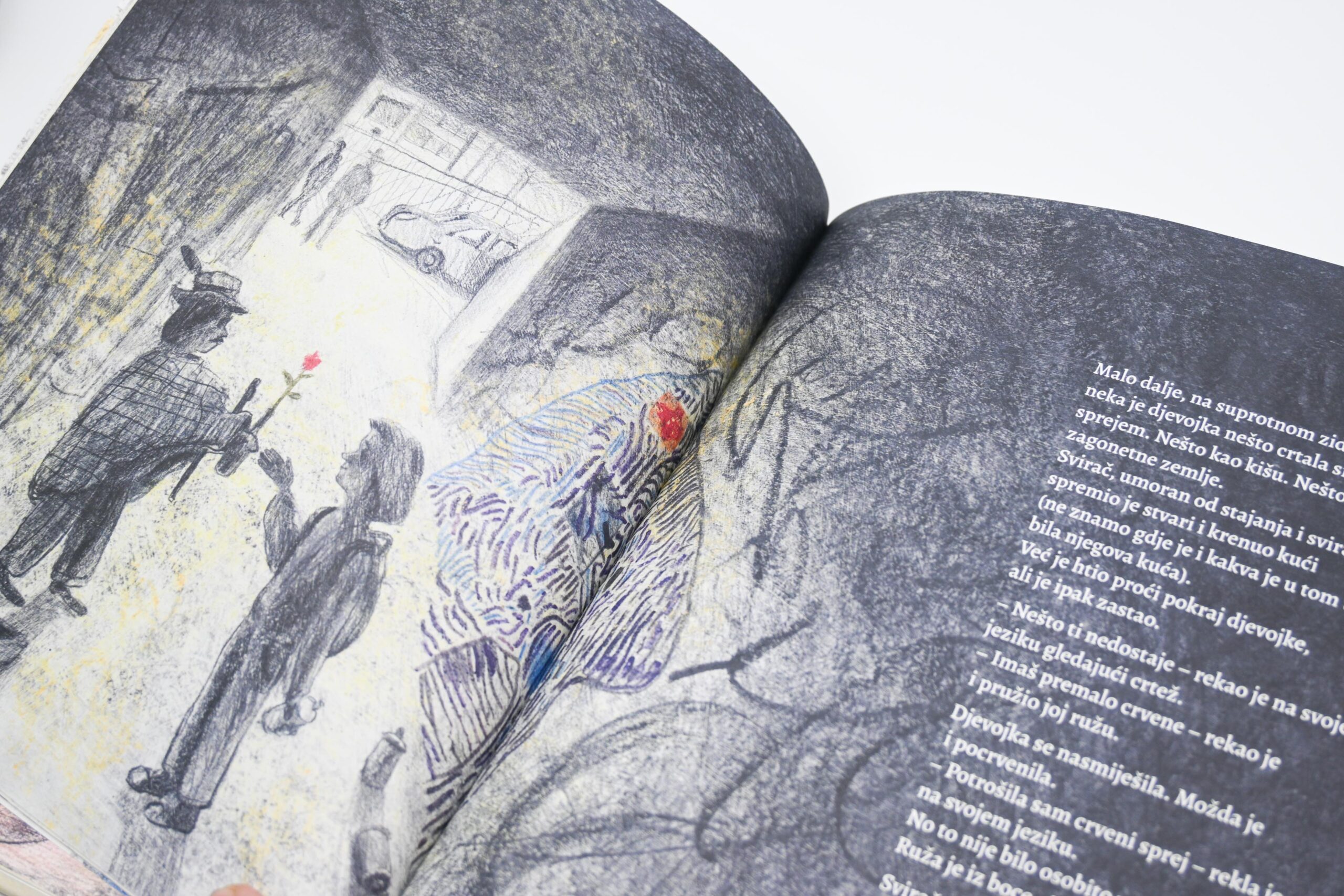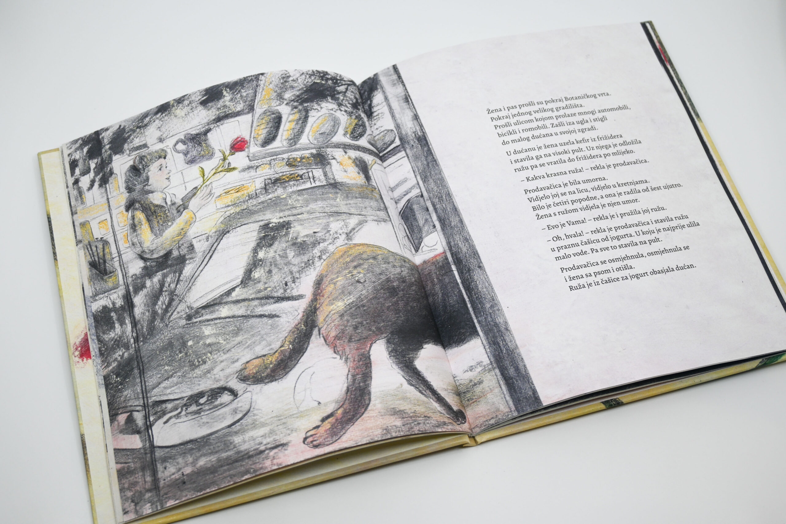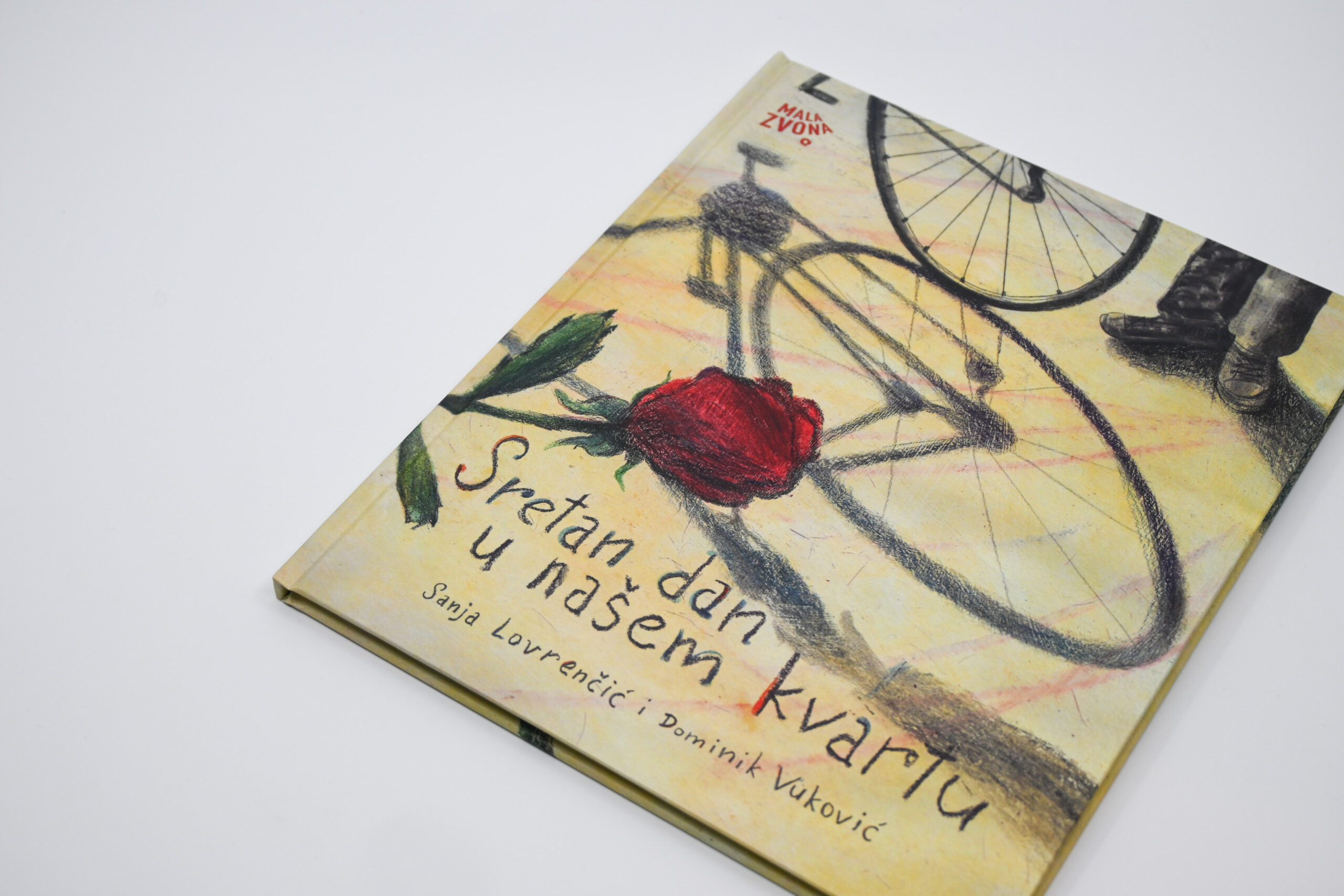 Nova slikovnica Sanje Lovrenčić i Dominika Vukovića prati putanju jedne ruže. Prelazeći iz ruke u ruku, crveni cvijet ocrtava obrise gradske četvrti kroz koju ga nose različiti likovi. Ta četvrt bogat je mikrosvijet u kojem se odvijaju slučajni susreti, mali dnevni rituali te nikad do kraja izrečene ljudske drame. Likovi među kojima ruža putuje pripadaju različitim društvenim skupinama: od šetača pasa, mladih roditelja, prodavačice u dućanu, stanovnice staračkog doma i mlade umjetnice, do marginalaca kao što su ostarjeli beskućnik i ulični svirač. Svi su oni, međutim, povezani jednostavnom gestom ljubaznosti: predajom ruže u sljedeću ruku. Ruža tako postaje metafora zajedništva kojom je pro­tkano gradsko tkivo, unatoč razlikama koje ga prožimaju. Konačno, taj lomljivi cvijet tematizira krhkost svake nježne geste ali – upravo zato – i njezinu ljepotu.