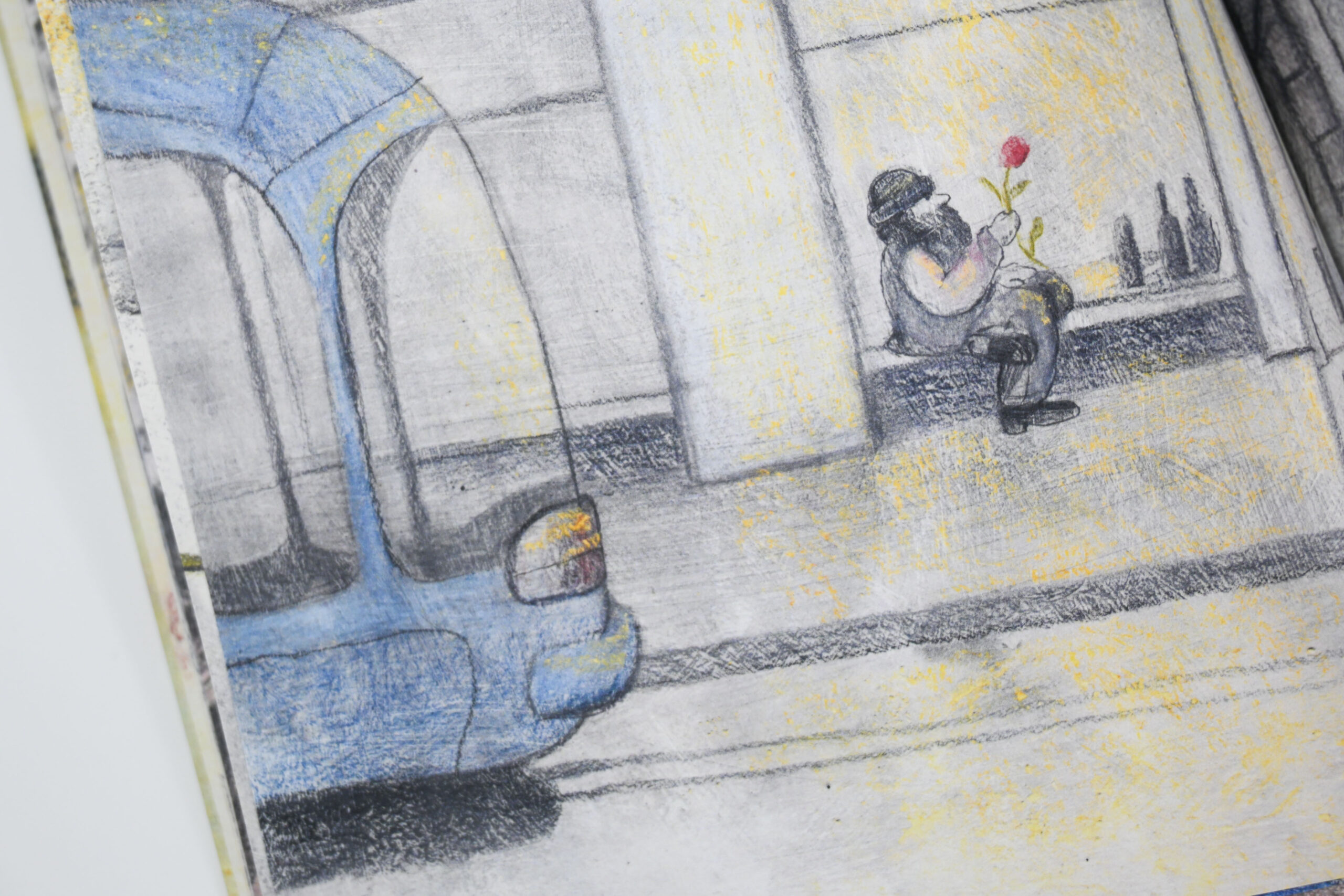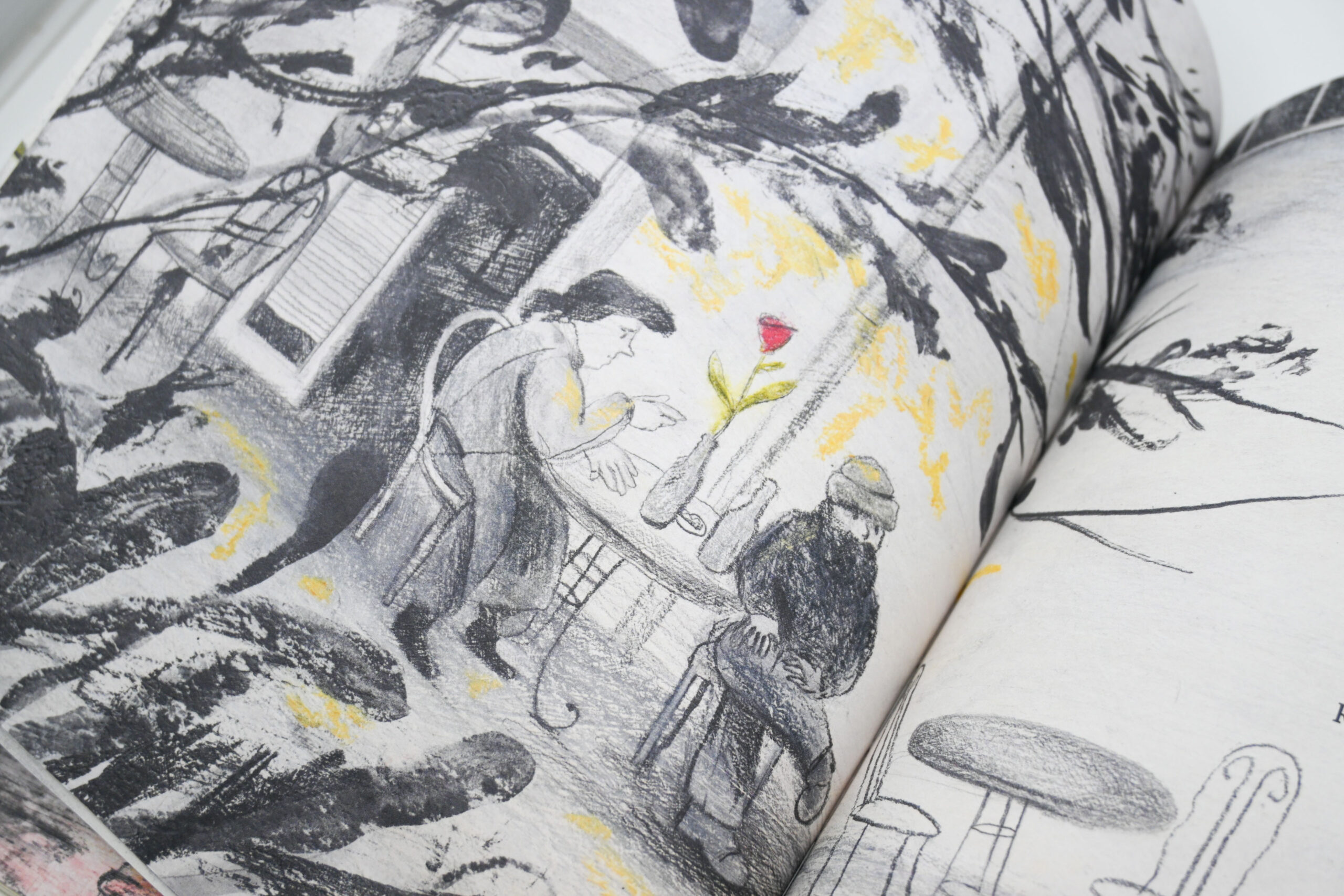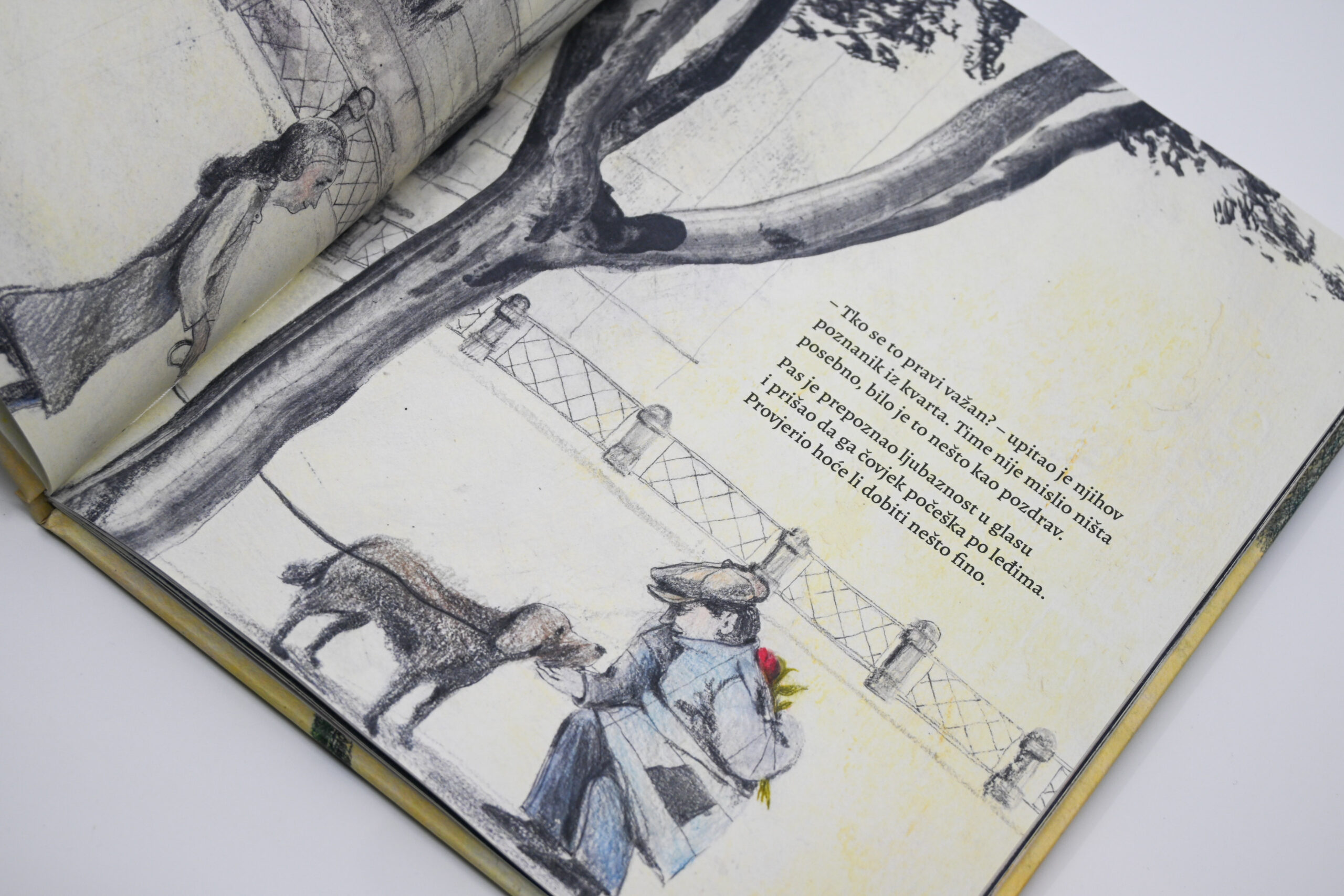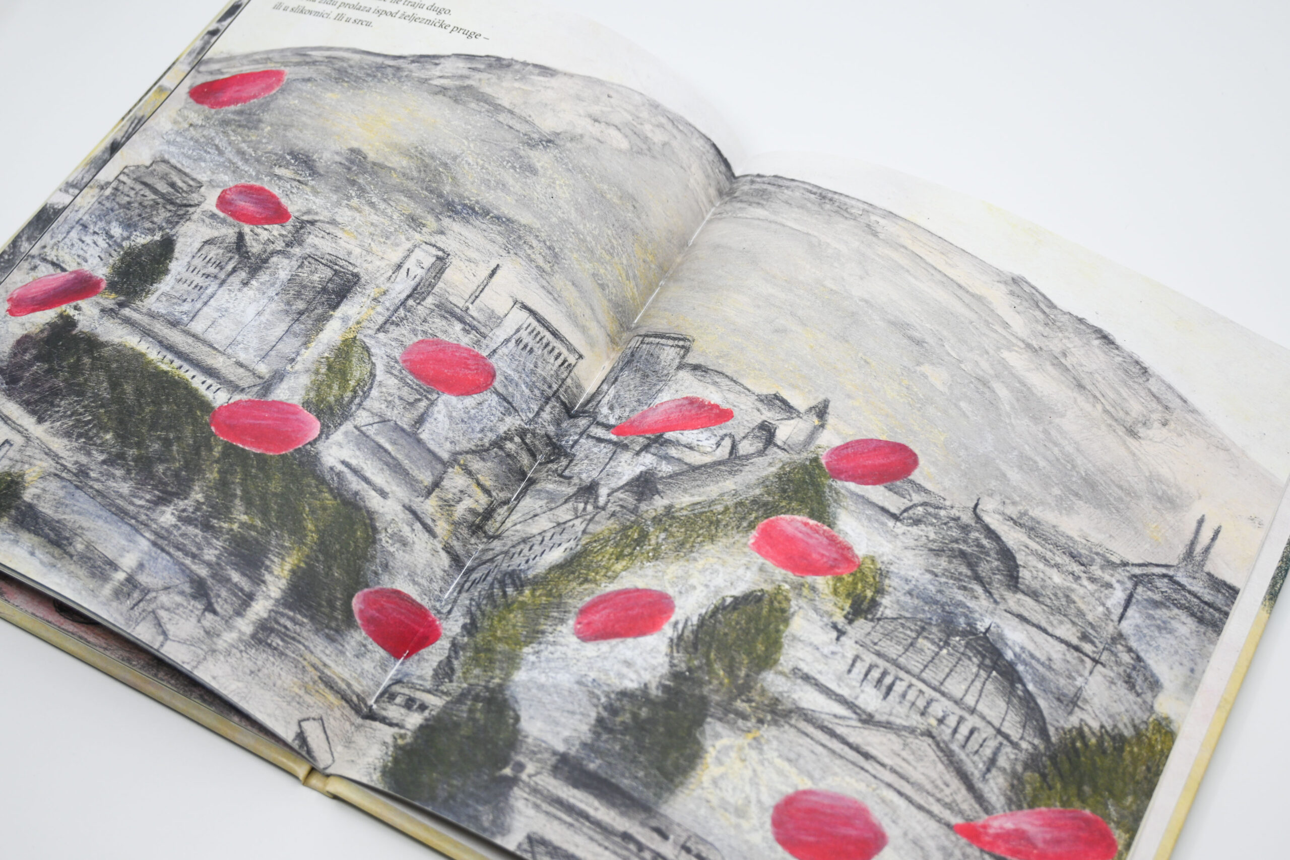 Nova slikovnica Sanje Lovrenčić i Dominika Vukovića prati putanju jedne ruže. Prelazeći iz ruke u ruku, crveni cvijet ocrtava obrise gradske četvrti kroz koju ga nose različiti likovi. Ta četvrt bogat je mikrosvijet u kojem se odvijaju slučajni susreti, mali dnevni rituali te nikad do kraja izrečene ljudske drame. Likovi među kojima ruža putuje pripadaju različitim društvenim skupinama: od šetača pasa, mladih roditelja, prodavačice u dućanu, stanovnice staračkog doma i mlade umjetnice, do marginalaca kao što su ostarjeli beskućnik i ulični svirač. Svi su oni, međutim, povezani jednostavnom gestom ljubaznosti: predajom ruže u sljedeću ruku. Ruža tako postaje metafora zajedništva kojom je pro­tkano gradsko tkivo, unatoč razlikama koje ga prožimaju. Konačno, taj lomljivi cvijet tematizira krhkost svake nježne geste ali – upravo zato – i njezinu ljepotu.
